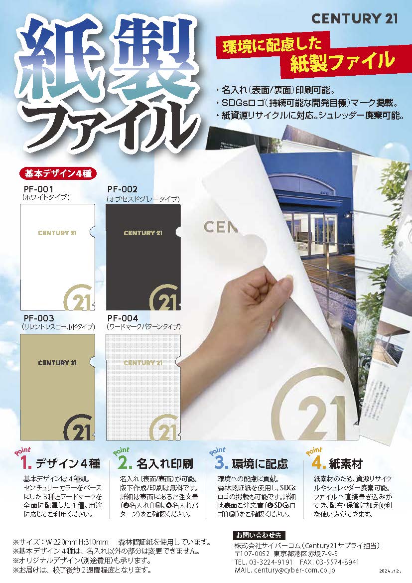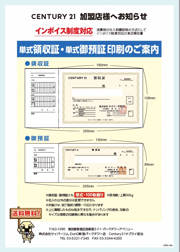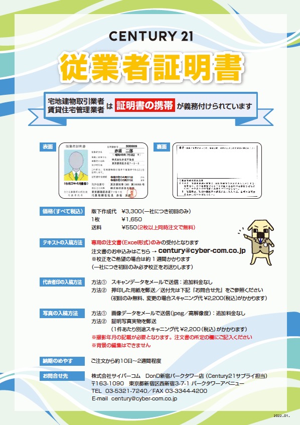 ユーザー専用ページ c21 承認サプライヤー 株式会社サイバーコム 取扱商品一覧 封筒印刷 > カタログ[PDF] (2024.12改訂) 名刺印刷 > カタログ[PDF] 従業者証明書 > カタログ[PDF] > 注 文 書[Excel] クリアファイル > カタログ[PDF] 紙製ファイル > カタログ[PDF] 便箋 > カタログ[PDF] 領収書・預証(単式) > カタログ[PDF] 領収書・預証(複写式) > カタログ[PDF] 開業、移転挨拶状 > カタログ[PDF] お問合せ:株式会社サイバーコム DonD赤坂店 TEL 03-3224-9191